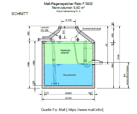 Bei starkem Regen steigt daher der Wasserstand in der Zisterne kurzfristig an und sinkt nach dem Regen wieder ab.